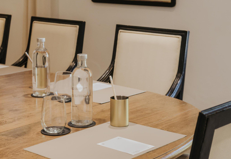 Dieser Salon des Restaurants vereint Eleganz und Komfort in einem vielseitigen Raum. Sein rustikaler Stil und die warmen Farbtöne schaffen eine einladende Atmosphäre, ideal für private Mittagessen, Präsentationen oder kleinere, persönliche Treffen.